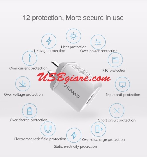 Cóc sạc cổng USB 5V 2.1A cho Mp3 Mp4 điện thoại Smart Phone, máy tính bảng, iPad. Với Smart Chip tự tìm dòng ra phù hợp, tự động ngắt khi sạc đầy cùng với 12 tính năng an toàn khác (xem bên dưới), nhỏ gọn dễ dàng mang bên mình.