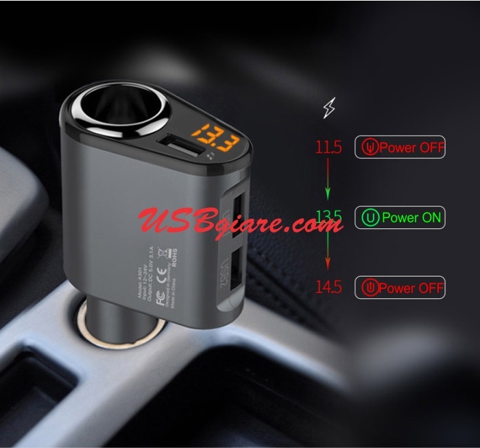Cóc sạc xe hơi ô tô ra 1 lỗ mồi thuốc (cigarette lighter) + 3 cổng USB 5V 3.1A để sạc điện thoại máy tính bảng và 1 khe cắm thẻ nhớ dùng để phát nhạc hoặc xem phìm
