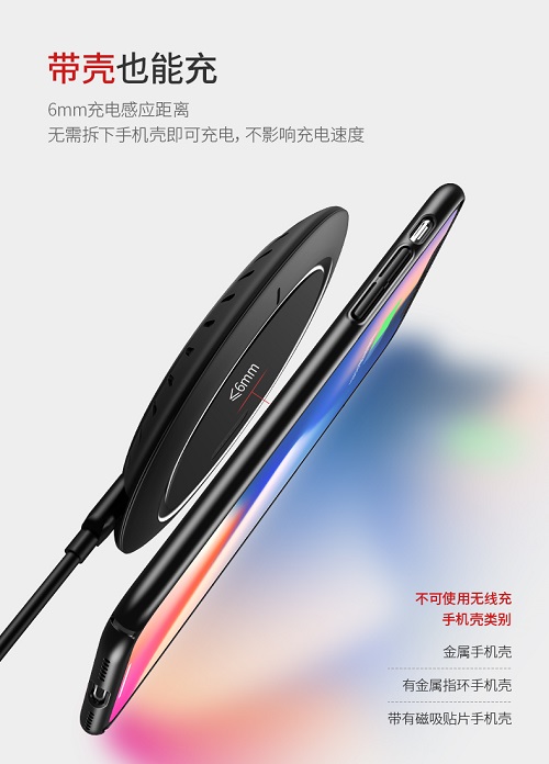• Khoảng cách nhận sạc 7.6mm, không cần phải tháo vỏ hay ốp lưng điện thoại để sạc (không hỗ trợ vỏ kim loại, case với magnetic sheet)