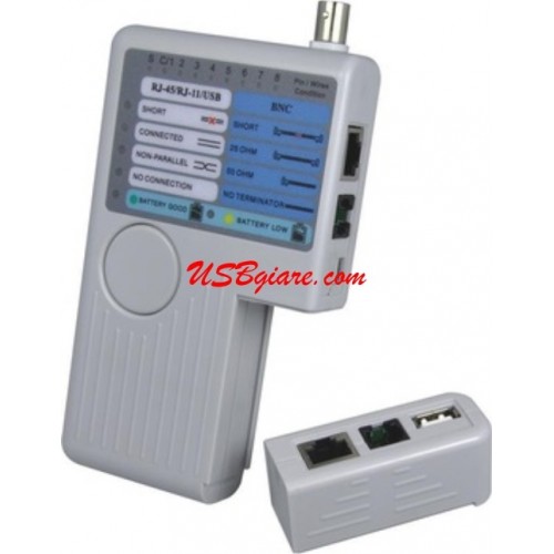 Máy test cáp hay còn gọi là bộ test cáp 4 in 1 chuyên nghiệp có thể test được các loại cáp: Cáp mạng Lan Network Rj45, cáp điện thoại Rj11, Cáp USB và cáp đồng trục Coxial